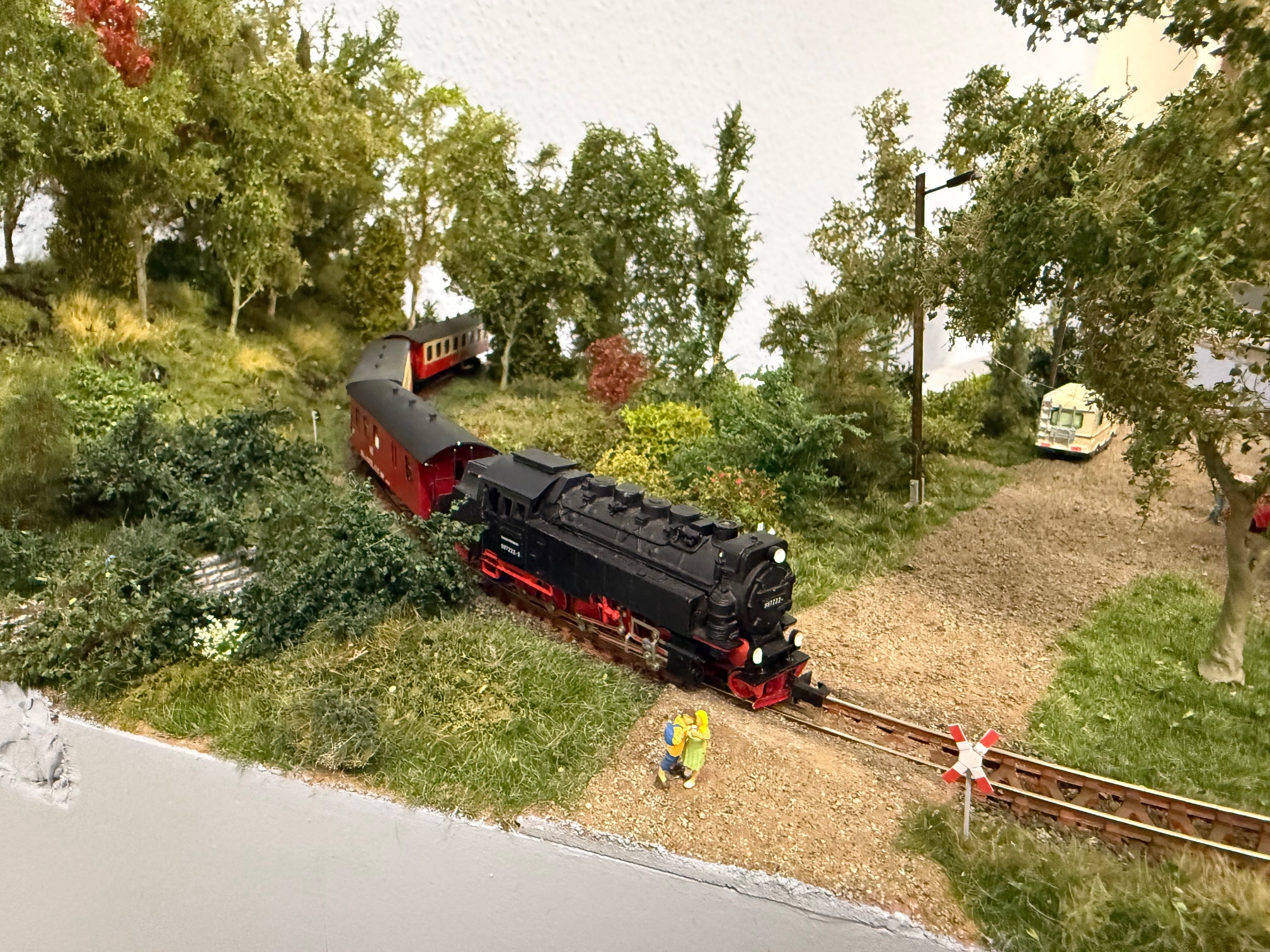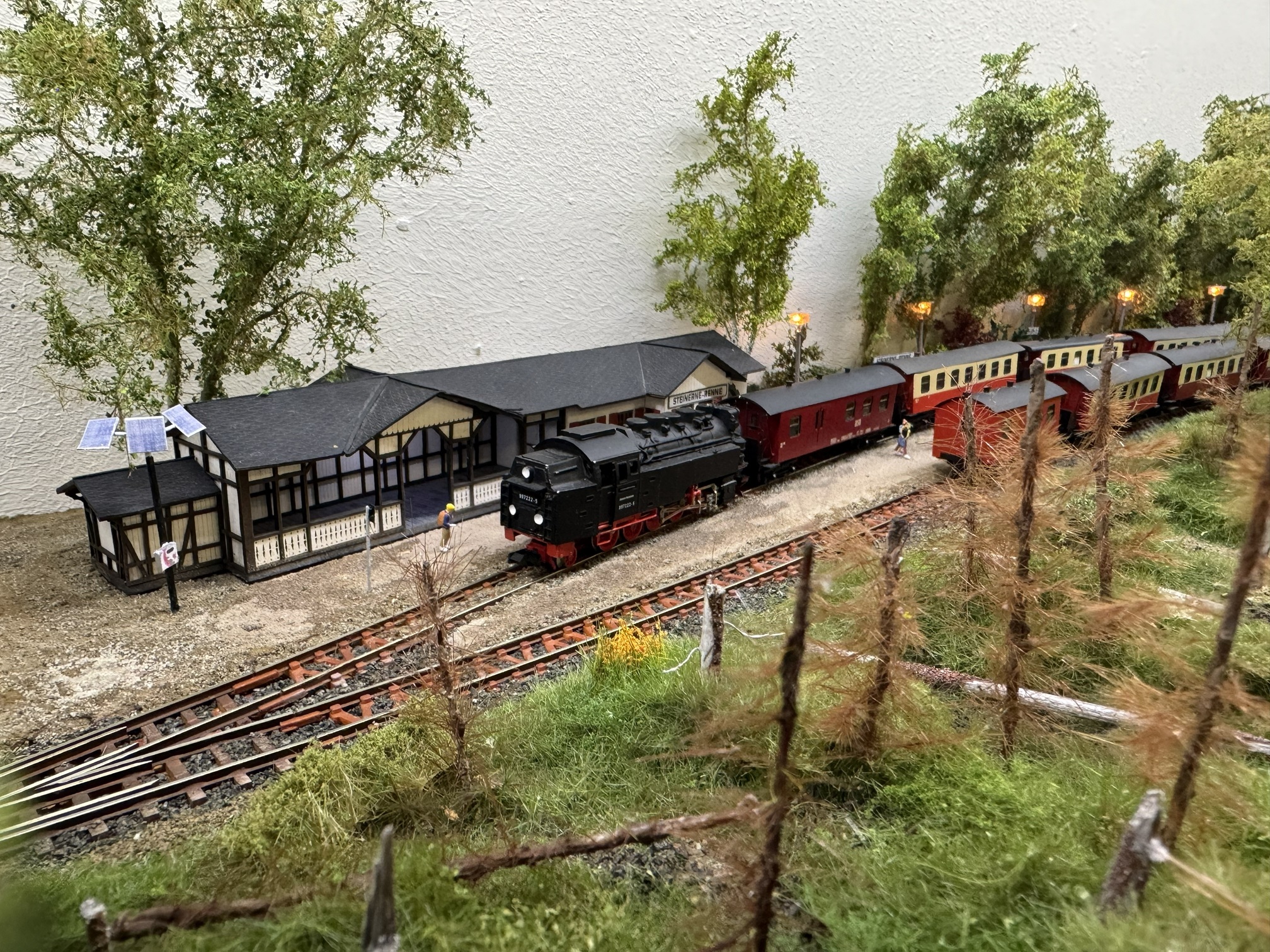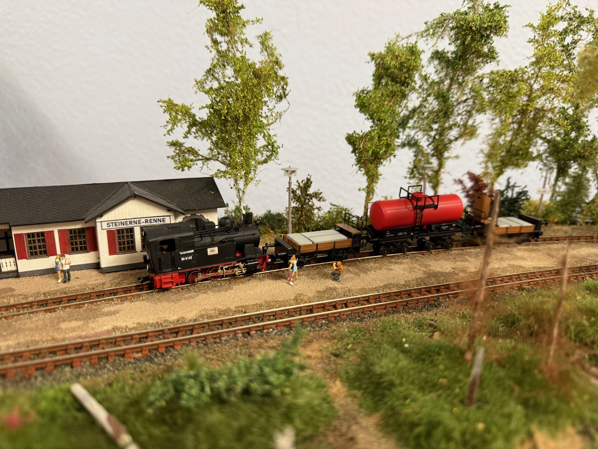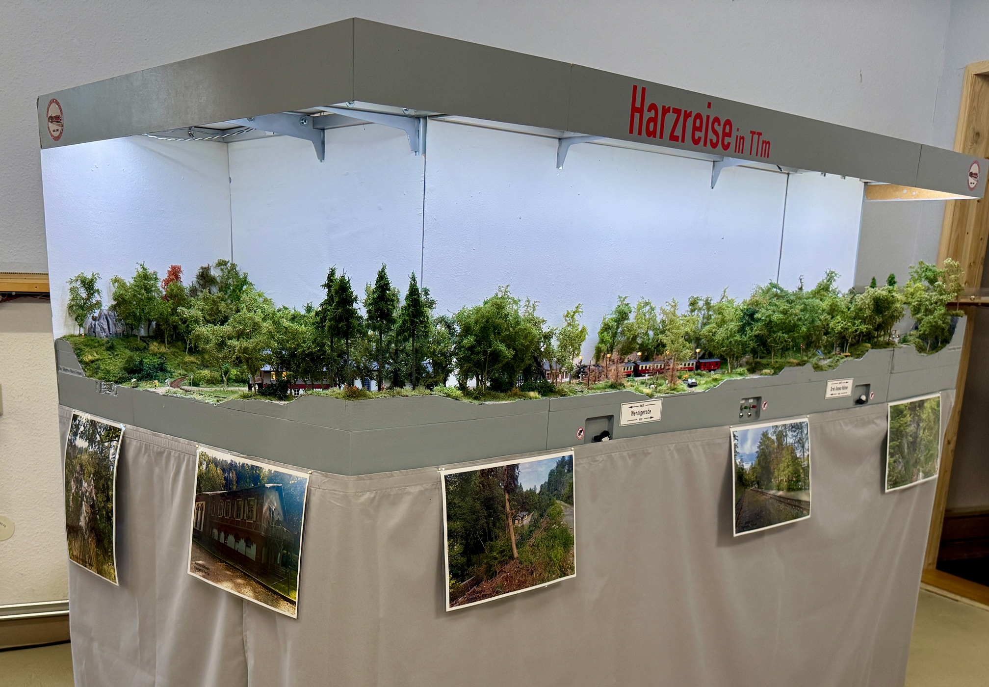 Wieso kommt man als kleiner Verein im östlichsten Zipfel von Sachsen auf die Idee eine Modellbahnanlage mit Harzer Motiven und noch dazu in so einer unbekannten Spurweite zu bauen? Ganz einfach aber auch traurig. Wir erhielten einen Nachlass von einem befreundeten Modellbahner. Dieser enthielt unter anderem ein paar Züge in TTm. Bis dahin hatte noch keiner von uns jemals Fahrzeuge in TTm gesehen beziehungsweise wusste, dass es so etwas überhaupt gibt. Die meisten Fahrzeuge sind von der Firma Kehi aus Eisenach. Leider musste in den frühen 2000ern die Firma ihren Betrieb einstellen. Zunächst bekamen unsere geerbten Fahrzeuge erst mal einen Schauplatz in einer Vitrine. Auf einer Messe fanden wir dann einen Bausatz des Bahnhofs Steinerne Renne. Damit sollte ein Diorama gebaut werden, wo die Modelle in Ihrem „natürlichen Habitat“ präsentiert werden können. Nach eingehender Recherche von Fachliteratur, Videomaterial und vor Ort Besichtigungen, sowie einigen Diskussionen fiel der Entschluss: „Und wenn wir schon Strom auf den Gleisen haben, können wir ja den Kreis auch schließen und die Züge auch kreiseln lassen.“ So wurde aus dem Diorama eine kleine transportable Modulanlage. Im Januar 2026 haben wir unsere neue Modellbahnanlage das erste Mal der Öffentlichkeit auf der Messe in Löbau vorstellen können.