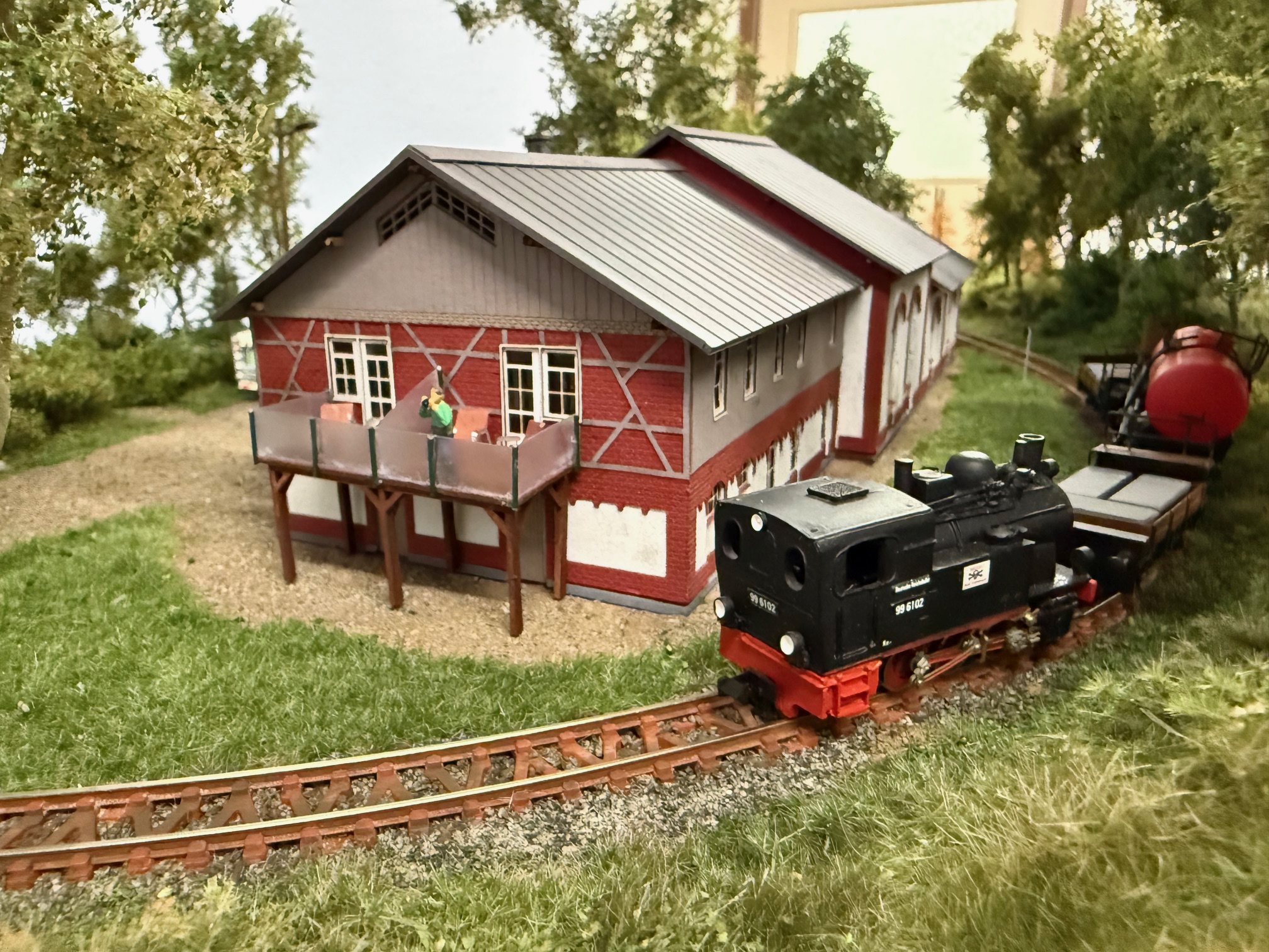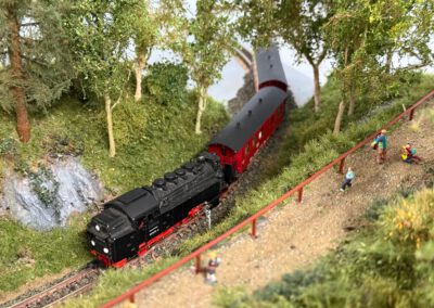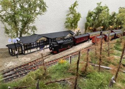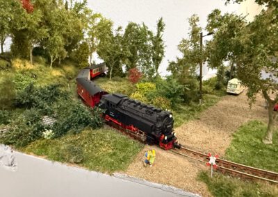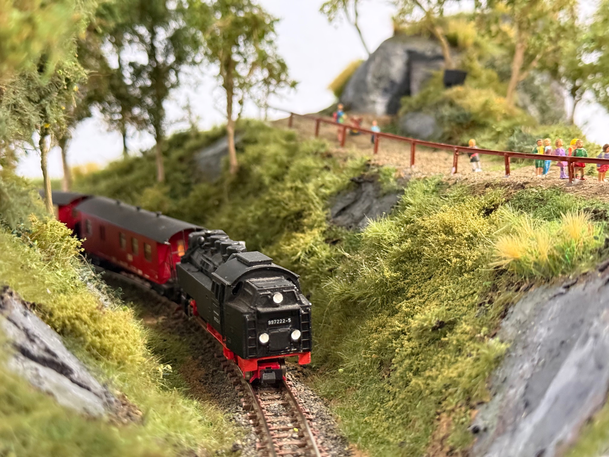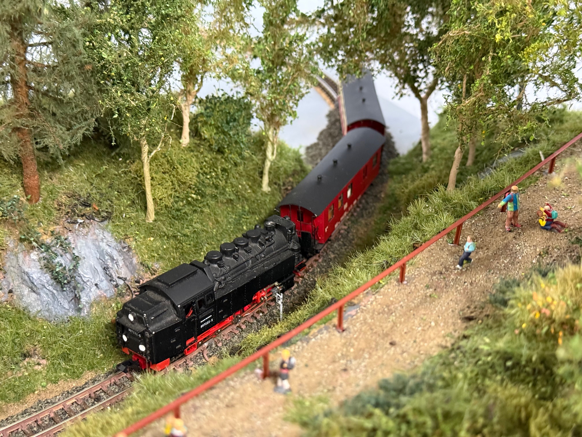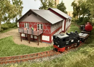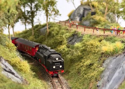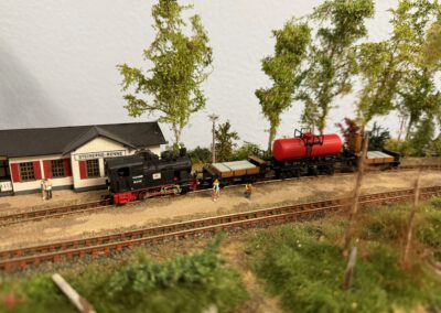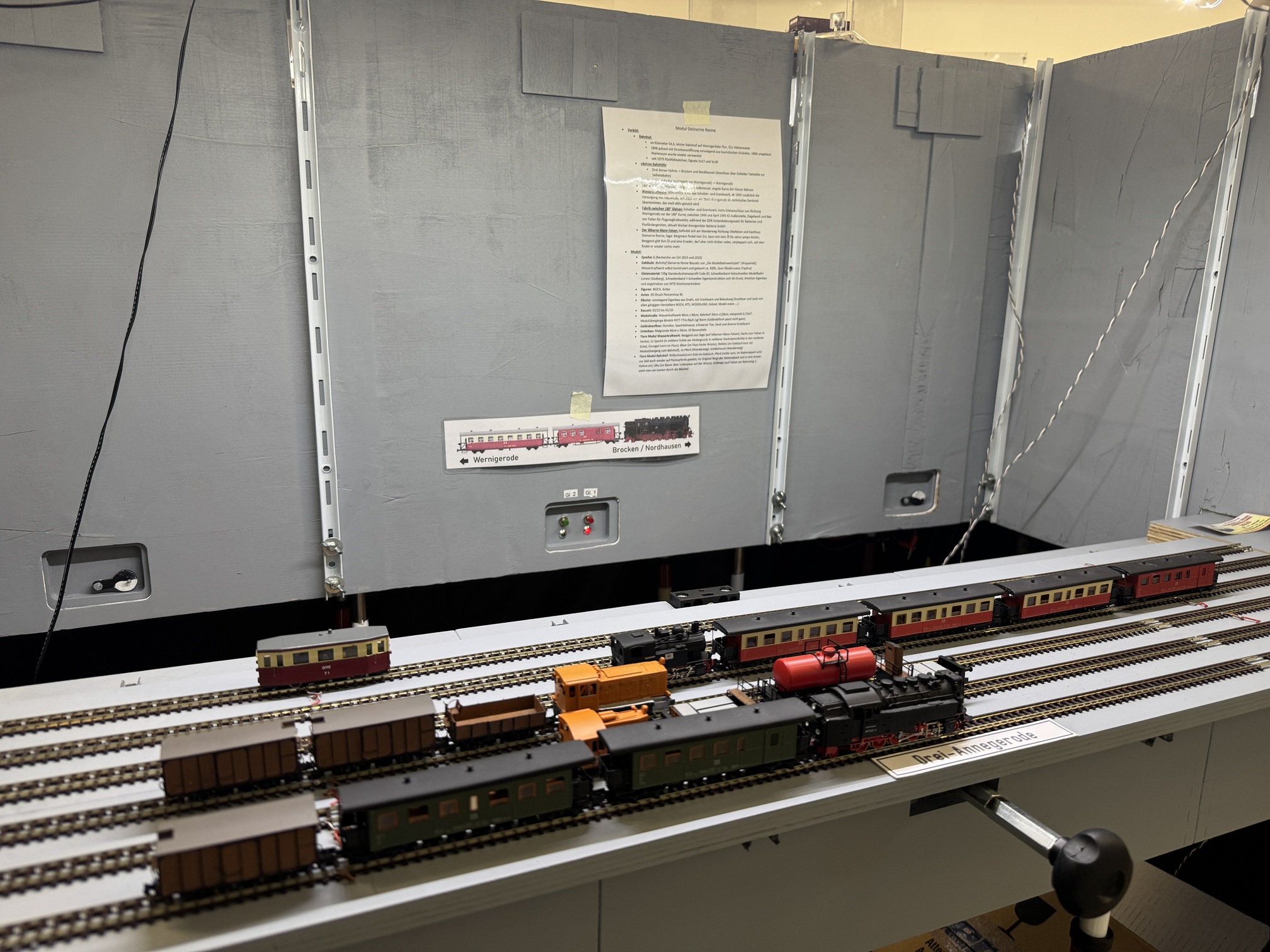 Wieso kommt man als kleiner Verein im östlichsten Zipfel von Sachsen auf die Idee eine Modellbahnanlage mit Harzer Motiven und noch dazu in so einer unbekannten Spurweite zu bauen? Ganz einfach aber auch traurig. Wir erhielten einen Nachlass von einem befreundeten Modellbahner. Dieser enthielt unter anderem ein paar Züge in TTm. Bis dahin hatte noch keiner von uns jemals Fahrzeuge in TTm gesehen beziehungsweise wusste, dass es so etwas überhaupt gibt. Die meisten Fahrzeuge sind von der Firma Kehi aus Eisenach. Leider musste in den frühen 2000ern die Firma ihren Betrieb einstellen. Zunächst bekamen unsere geerbten Fahrzeuge erst mal einen Schauplatz in einer Vitrine. Auf einer Messe fanden wir dann einen Bausatz des Bahnhofs Steinerne Renne. Damit sollte ein Diorama gebaut werden, wo die Modelle in Ihrem „natürlichen Habitat“ präsentiert werden können. Nach eingehender Recherche von Fachliteratur, Videomaterial und vor Ort Besichtigungen, sowie einigen Diskussionen fiel der Entschluss: „Und wenn wir schon Strom auf den Gleisen haben, können wir ja den Kreis auch schließen und die Züge auch kreiseln lassen.“ So wurde aus dem Diorama eine kleine transportable Modulanlage. Im Januar 2026 haben wir unsere neue Modellbahnanlage das erste Mal der Öffentlichkeit auf der Messe in Löbau vorstellen können.