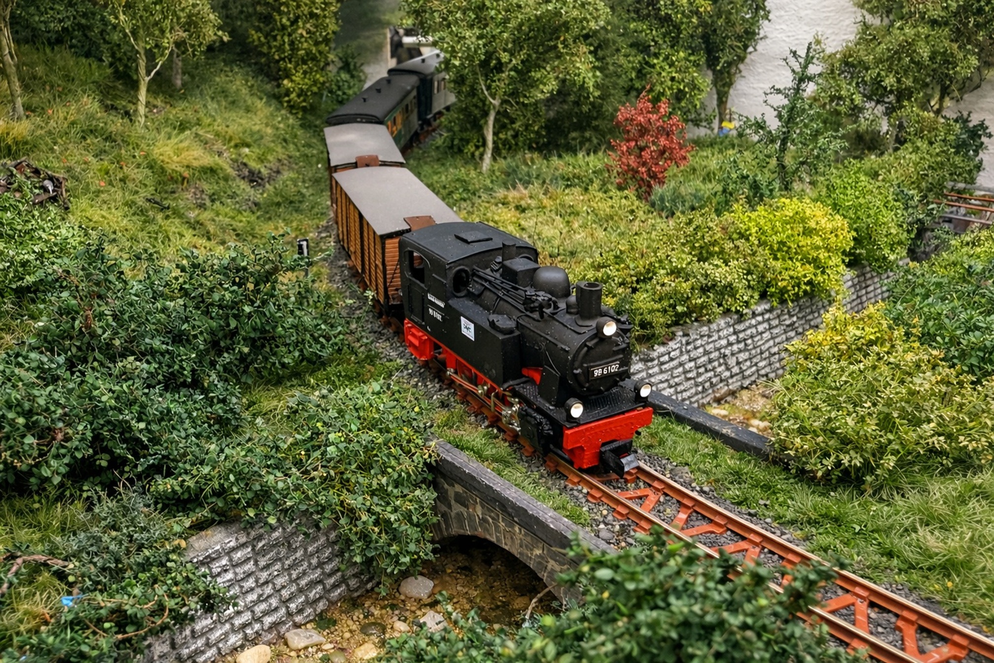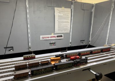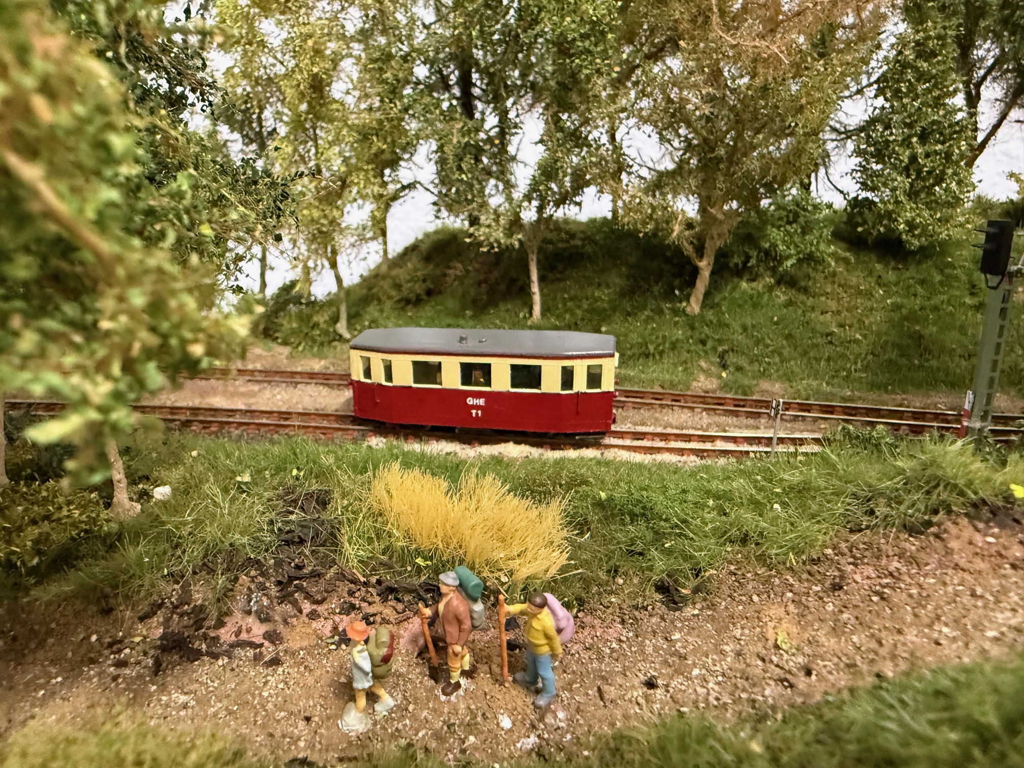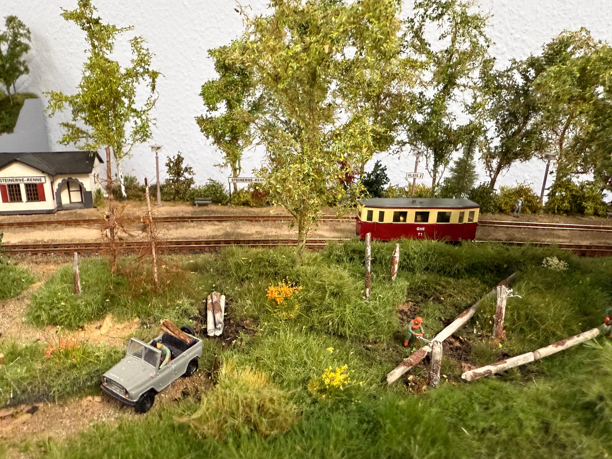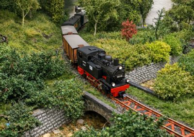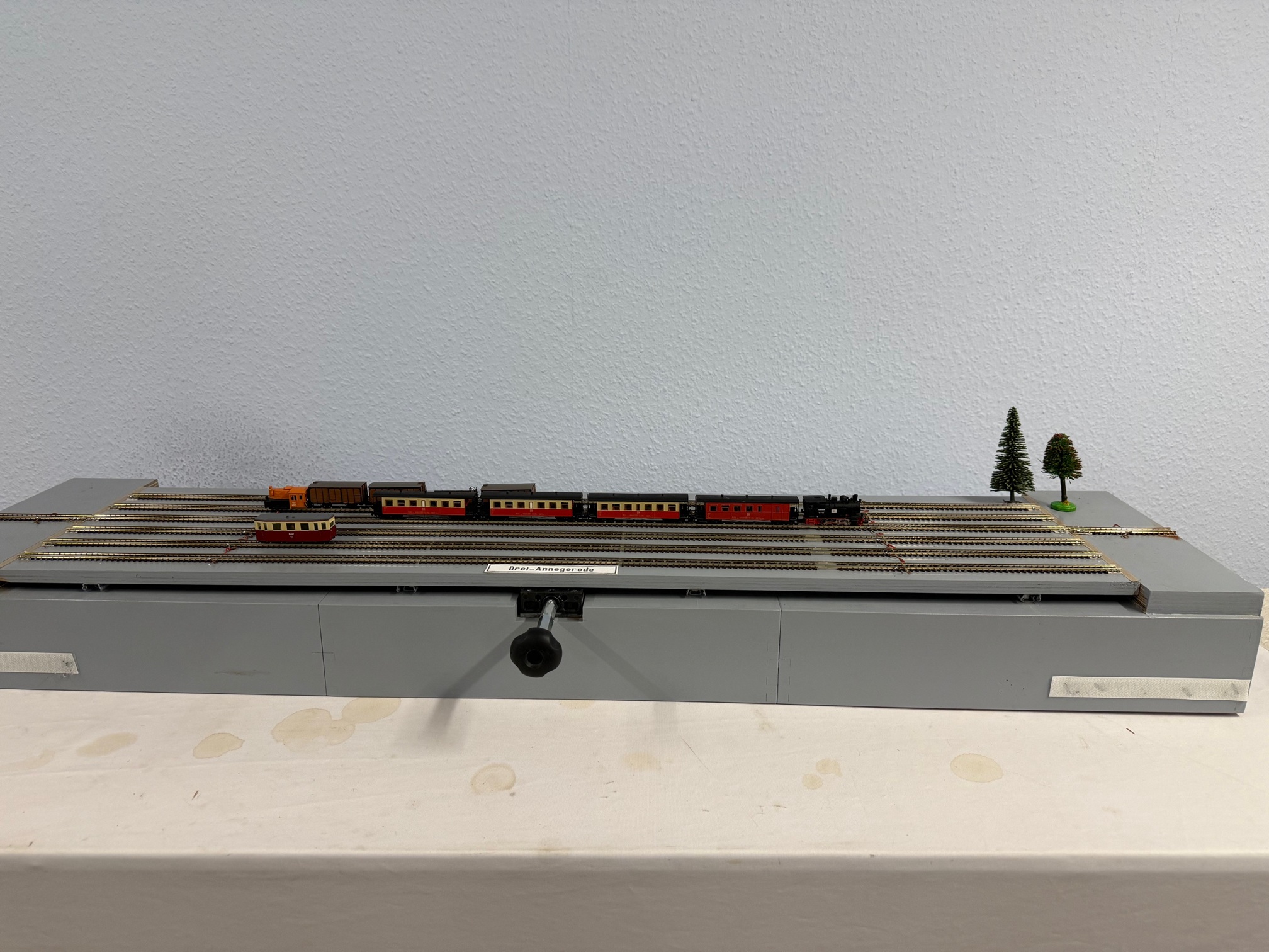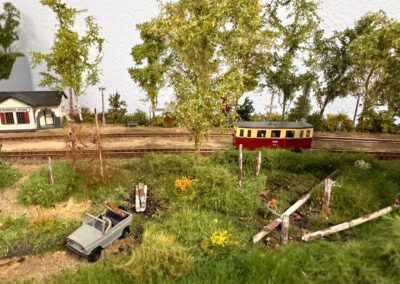 Wieso kommt man als kleiner Verein im östlichsten Zipfel von Sachsen auf die Idee eine Modellbahnanlage mit Harzer Motiven und noch dazu in so einer unbekannten Spurweite zu bauen? Ganz einfach aber auch traurig. Wir erhielten einen Nachlass von einem befreundeten Modellbahner. Dieser enthielt unter anderem ein paar Züge in TTm. Bis dahin hatte noch keiner von uns jemals Fahrzeuge in TTm gesehen beziehungsweise wusste, dass es so etwas überhaupt gibt. Die meisten Fahrzeuge sind von der Firma Kehi aus Eisenach. Leider musste in den frühen 2000ern die Firma ihren Betrieb einstellen. Zunächst bekamen unsere geerbten Fahrzeuge erst mal einen Schauplatz in einer Vitrine. Auf einer Messe fanden wir dann einen Bausatz des Bahnhofs Steinerne Renne. Damit sollte ein Diorama gebaut werden, wo die Modelle in Ihrem „natürlichen Habitat“ präsentiert werden können. Nach eingehender Recherche von Fachliteratur, Videomaterial und vor Ort Besichtigungen, sowie einigen Diskussionen fiel der Entschluss: „Und wenn wir schon Strom auf den Gleisen haben, können wir ja den Kreis auch schließen und die Züge auch kreiseln lassen.“ So wurde aus dem Diorama eine kleine transportable Modulanlage. Im Januar 2026 haben wir unsere neue Modellbahnanlage das erste Mal der Öffentlichkeit auf der Messe in Löbau vorstellen können.