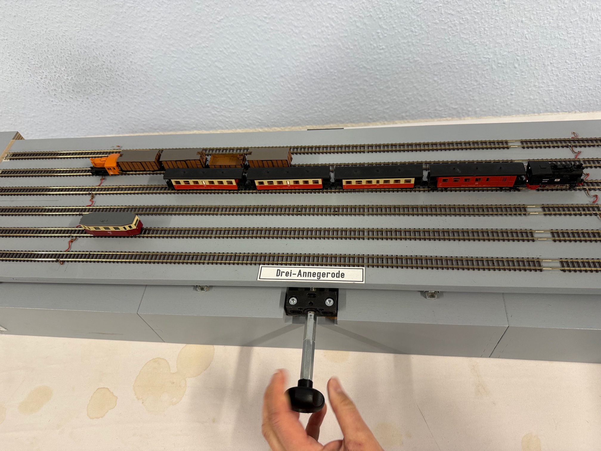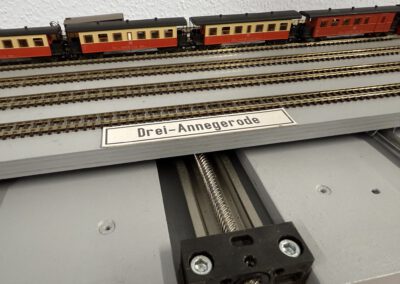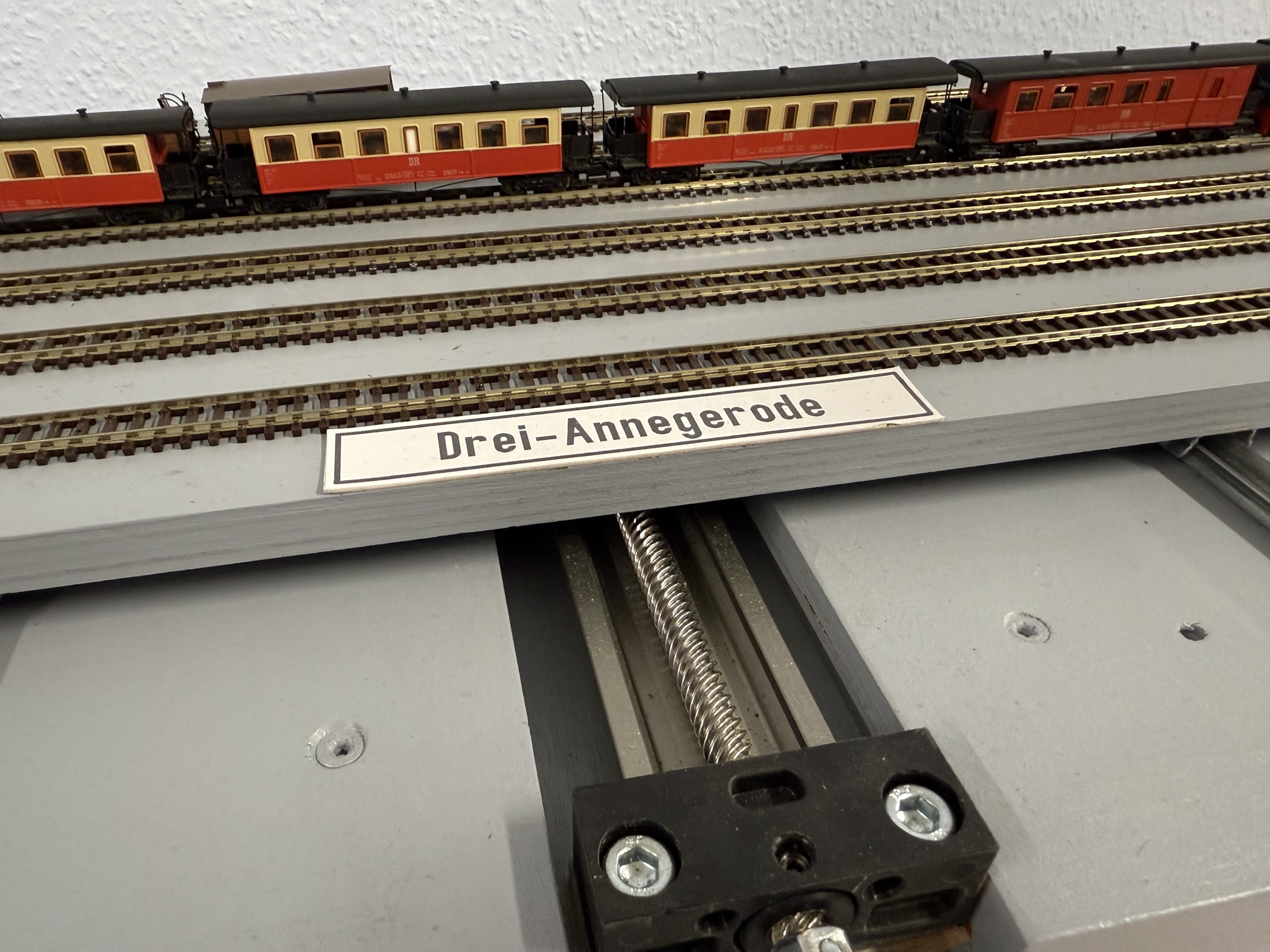 Die Anlagenteile „Steinerne Renne“ (zwei Module) und das Anlagenteil „Grube König Friedrich“ (ein Modul) bilden den sichtbaren Teil. Im Vorbild fahren die Züge vom Bahnhof Steinerne Renne auf eingleisiger Strecke jeweils in Richtung Wernigerode oder Drei Annen Hohne. Auf unserer Modellbahnanlage treffen beide Strecken auf unserem vierten Modul dem Schattenbahnhof „Drei-Annegerode“ zusammen. Der Schattenbahnhof ist als eine Art sechsgleisige Schiebebühne ausgeführt. Zurzeit wird analog geschalten und analog mit einem Heißwolfregler gefahren.
