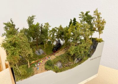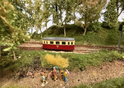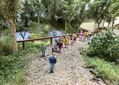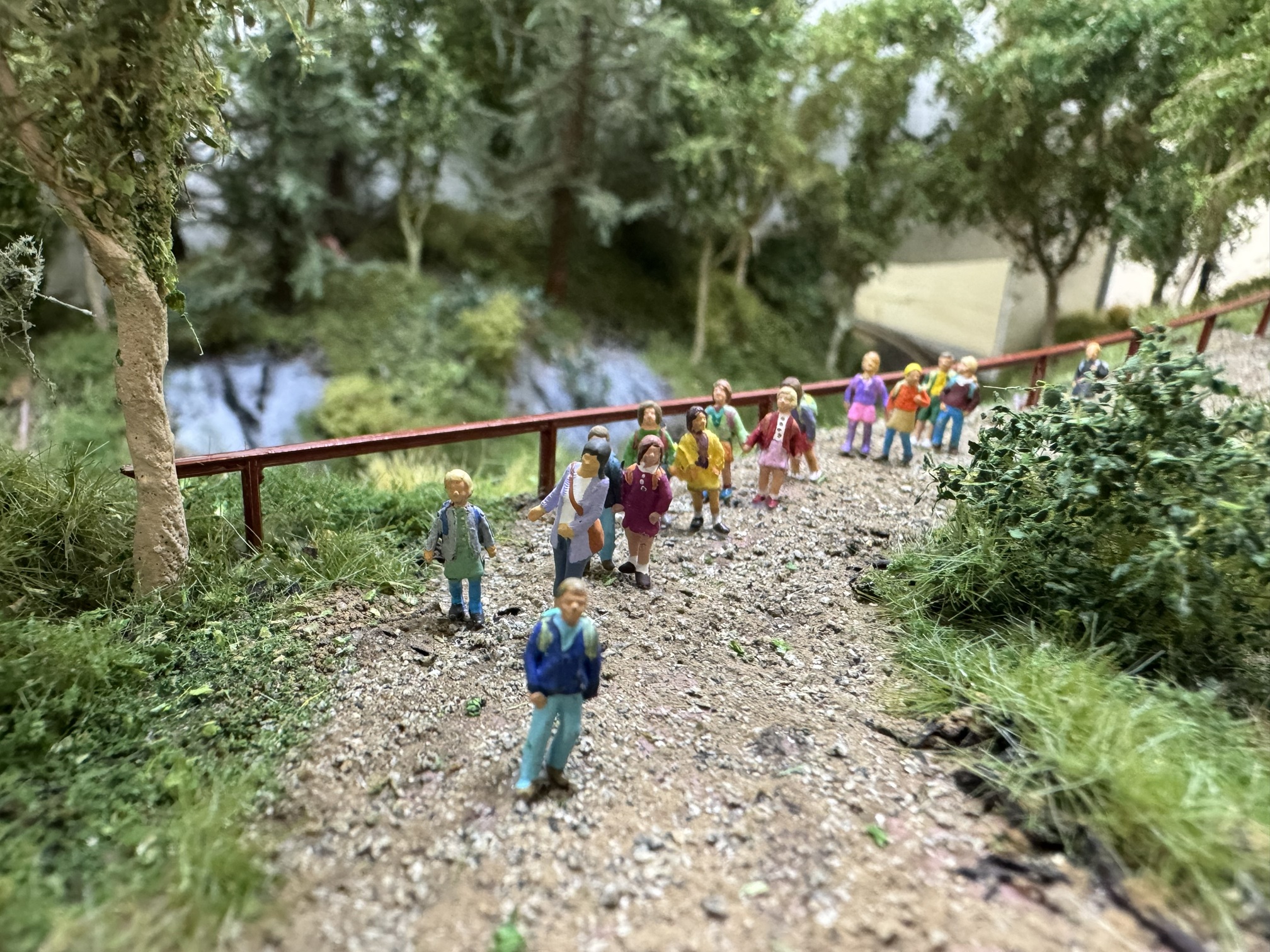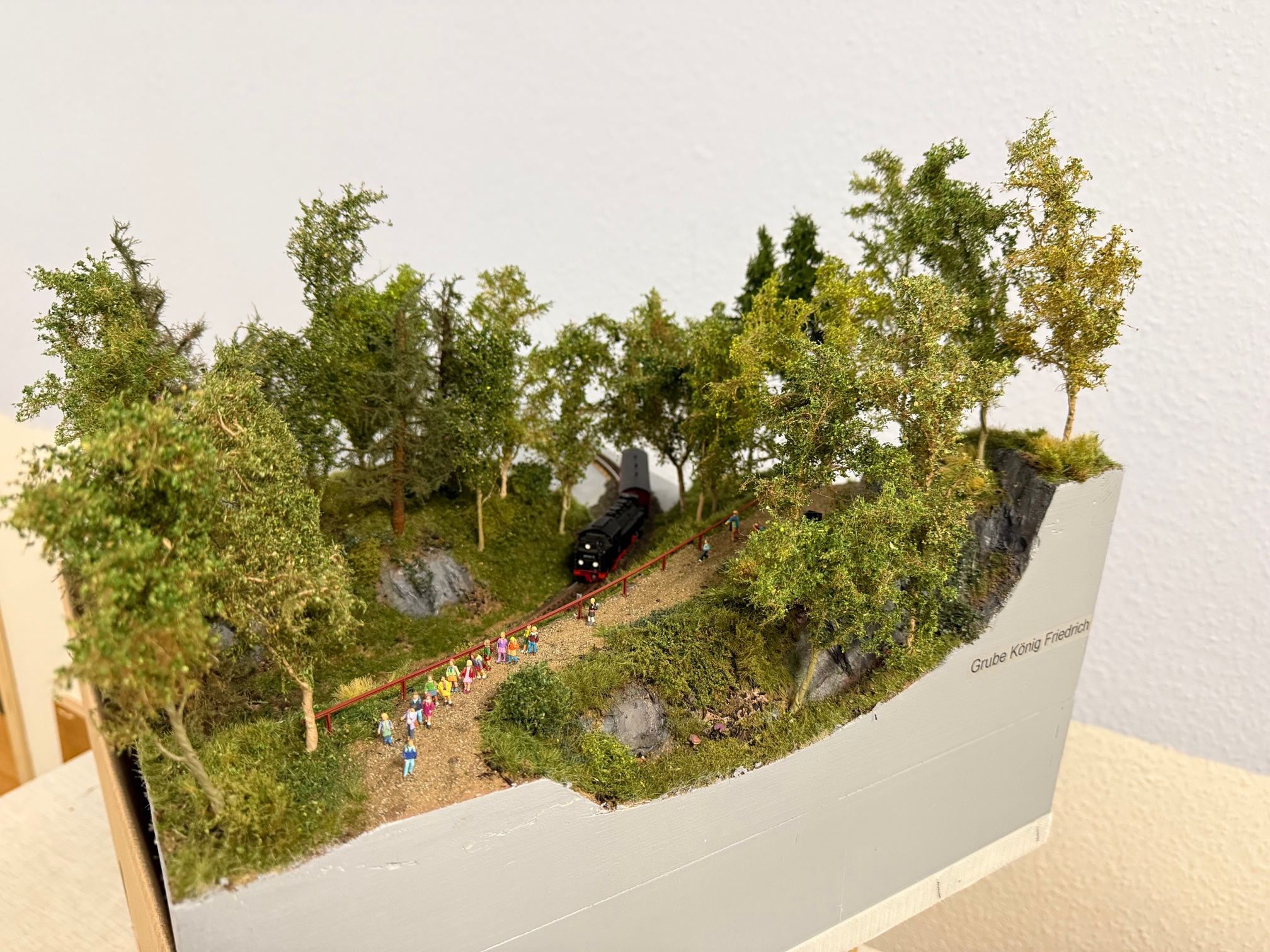 Der Anlagenteil „Grube König Friedrich“ bildet die Kurve zurück in den Schattenbahnhof. Der Bahnparallelweg, der im Original auch parallel zur Bahnlinie verläuft und auch schon auf den anderen beiden Modulen immer mal wieder zu sehen war, führt hier an dem Mundloch des Bergwerkes „Grube König Friedrich“ vorbei. Eine Schulklasse wandert den Weg lang. Ob sie das Bergwerk aus dem 17.-18. Jahrhundert besichtigt haben oder doch lieber mit der Eisenbahn fahren wollen?