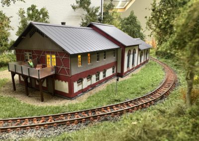 Auf dem zweiten Modul befindet sich das Wasserkraftwerk Steinerne Renne mit dem markanten 180° Kreisbogen. Dieser hat im Original einen Halbdurchmesser von 60m und ist der engste im gesamten Netz der Harzer Schmalspurbahnen. Aktuell sind in dieser Kurve sogenannte Y-Schwellen verbaut, welche für eine stabilere Gleislage sorgen. Da diese nicht käuflich zu erwerben sind, wurden sie von uns kurzer Hand selbst konstruiert und mittels 3D-Druck gefertigt. In der Kurve steht das Wasserkraftwerk Steinerne Renne. Es wurde bereits 1899 gebaut und wird auch heute noch genutzt. Dieses auffällige Gebäude konnten wir natürlich nicht weglassen und haben es in vielen, vielen Stunden konstruiert, per Laser ausgeschnitten und zusammengebaut. Hinter dem Flüsschen „Holtemme“, die das Modul einmal quer kreuzt, geht es wieder in den Wald. Hier findet man noch den sagenumwobenen Silbernen Mann Felsen. Mit etwas Glück kann man hier ein Selfie mit dem Berggeist aus einer der vielen Harzer Sagen machen.